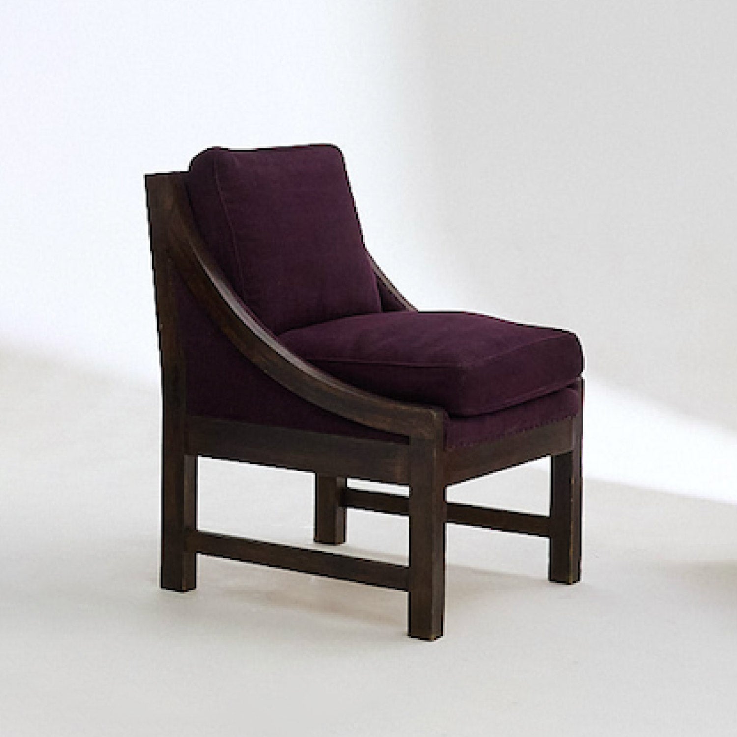 Sourced from the archives of a luxury British brand, this beautiful armchair will add charm to your space. Luxe soft purple cushions are nestled in an exposed dark wood frame with gently curved arms on an otherwise minimalist armchair design.