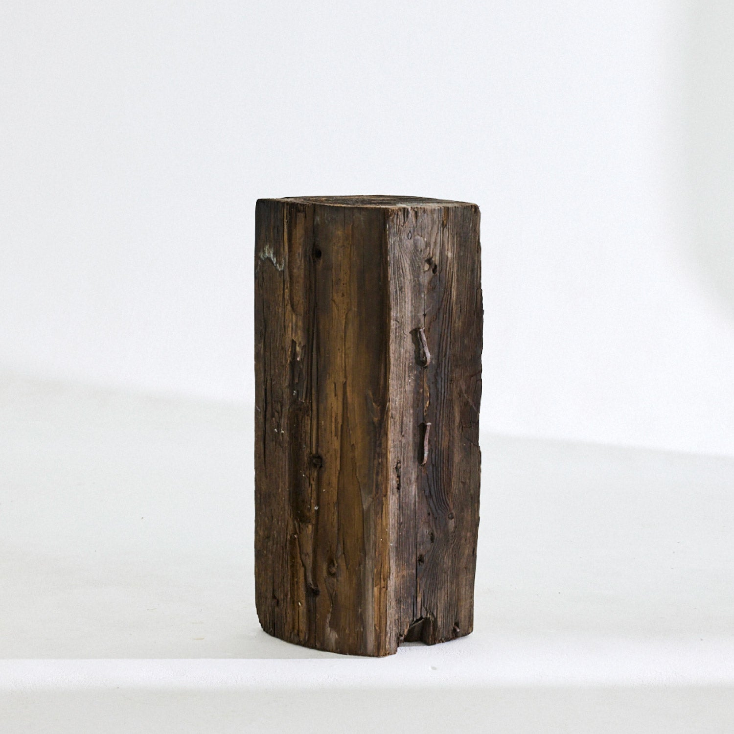 Sourced from the archives of a luxury British brand, this wooden plinth is perfect as a unique and stylish side table. Crafted from reclaimed dark wood reminiscent of a beach groyne, the one-of-a-kind raw look makes it an ideal fit for contemporary interiors.